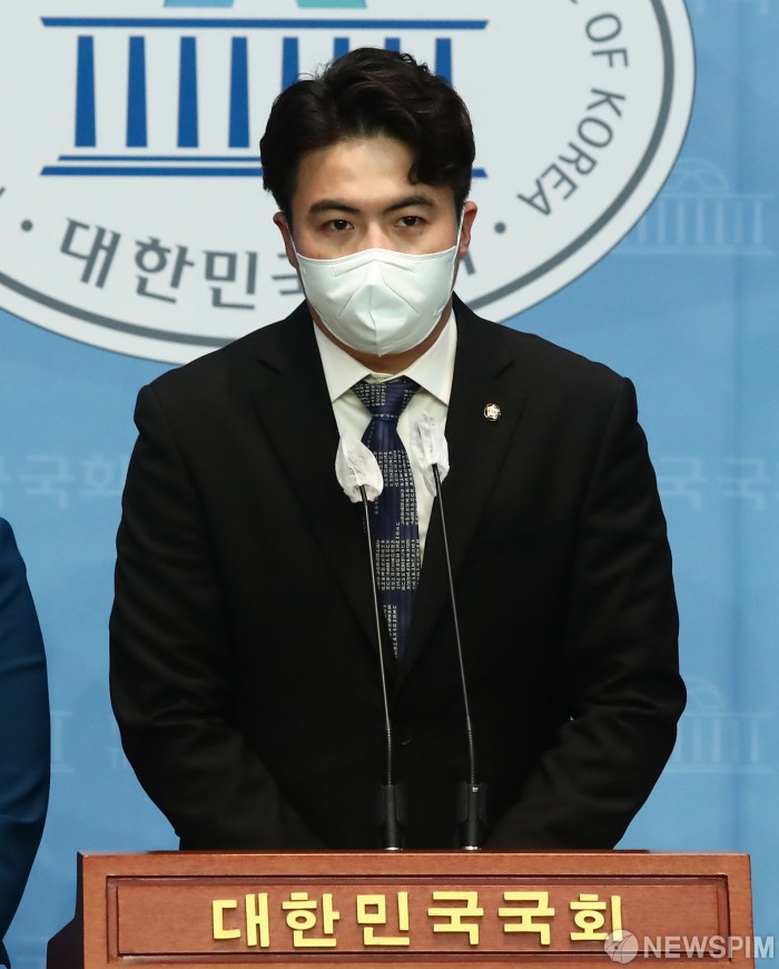 [서울=뉴스핌] 김민지 기자 = 오영환 더불어민주당 신임 원내대변인이 27일 서울 여의도 국회 소통관에서 기자회견을 열고 원내대변인단을 발표하고 있다. 오른쪽부터 박 원내대표, 오영환 의원, 이수진 의원. 2022.03.27 kimkim@newspim.com