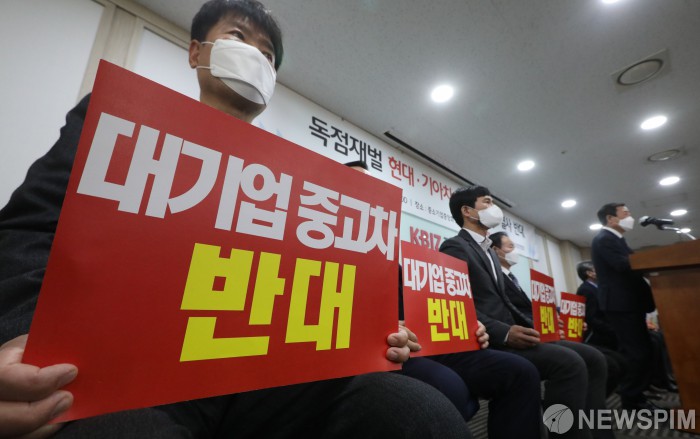 [서울=뉴스핌] 황준선 기자 = 장남해 전국자동차매매사업조합연합회 회장과 조합원들이 29일 오후 서울 여의도 중소기업중앙회에서 현대·기아차의 매매업 진출 반대 기자회견을 하고 있다. 2022.03.29 hwang@newspim.com