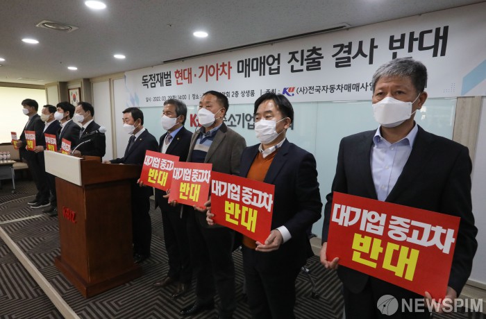 [서울=뉴스핌] 황준선 기자 = 장남해 전국자동차매매사업조합연합회 회장과 조합원들이 29일 오후 서울 여의도 중소기업중앙회에서 현대·기아차의 매매업 진출 반대 기자회견을 하고 있다. 2022.03.29 hwang@newspim.com