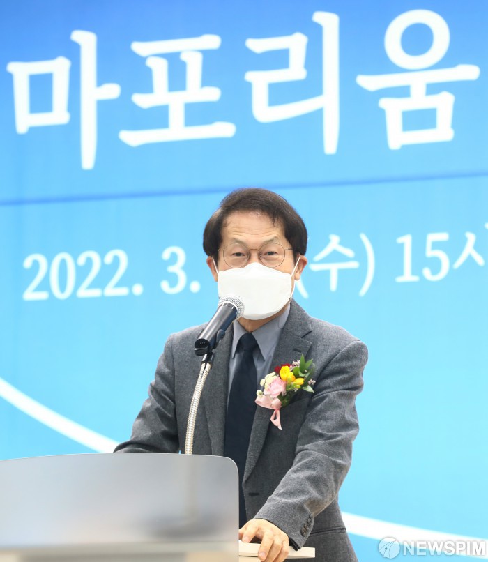 [서울=뉴스핌] 김민지 기자 = 조희연 서울시교육감이 30일 오후 서울 마포구 마포평생학습관에서 열린 마포리움 개관식에서 축사를 하고 있다. 마포리움은 개방형 문화예술공간으로 북타워와 열람공간, 무대, 전시장, 카페 등으로 구성됐다. 2022.03.30 kimkim@newspim.com