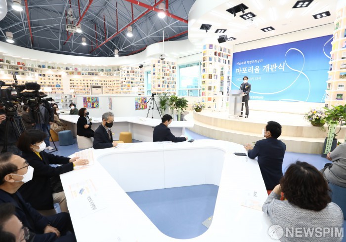 [서울=뉴스핌] 김민지 기자 = 조희연 서울시교육감이 30일 오후 서울 마포구 마포평생학습관에서 열린 마포리움 개관식에서 축사를 하고 있다. 마포리움은 개방형 문화예술공간으로 북타워와 열람공간, 무대, 전시장, 카페 등으로 구성됐다. 2022.03.30 kimkim@newspim.com