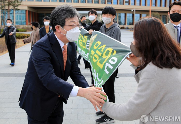 [서울=뉴스핌] 이형석 기자 = 유승민 전 국민의힘 의원이 31일 오후 서울 여의도 국회 소통관에서 6.1 지방선거 경기지사 출마 기자회견을 마친 뒤 지지자들과 인사하고 있다. 2022.03.31 leehs@newspim.com