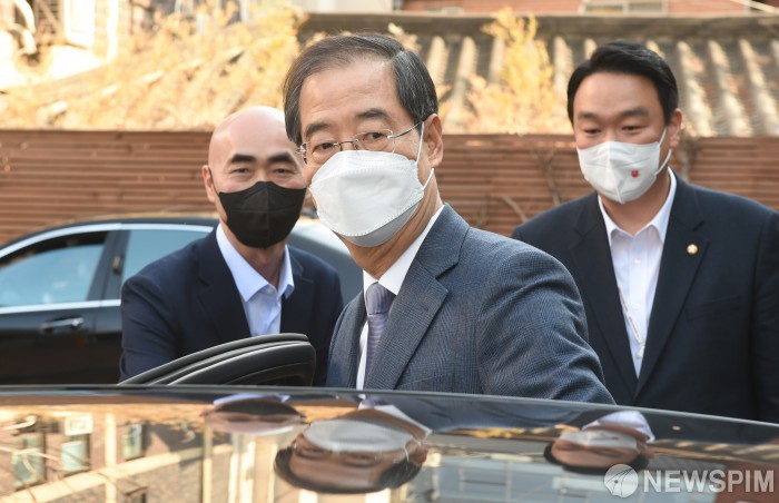 [서울=뉴스핌] 인수위사진기자단 = 윤석열 정부의 첫 신임 국무총리로 지명된 한덕수 전 총리가 3일 오후 서울 종로구 통의동 대통령직인수위원회에서 기자회견을 마친 후 떠나고 있다. 2022.04.03 photo@newspim.com