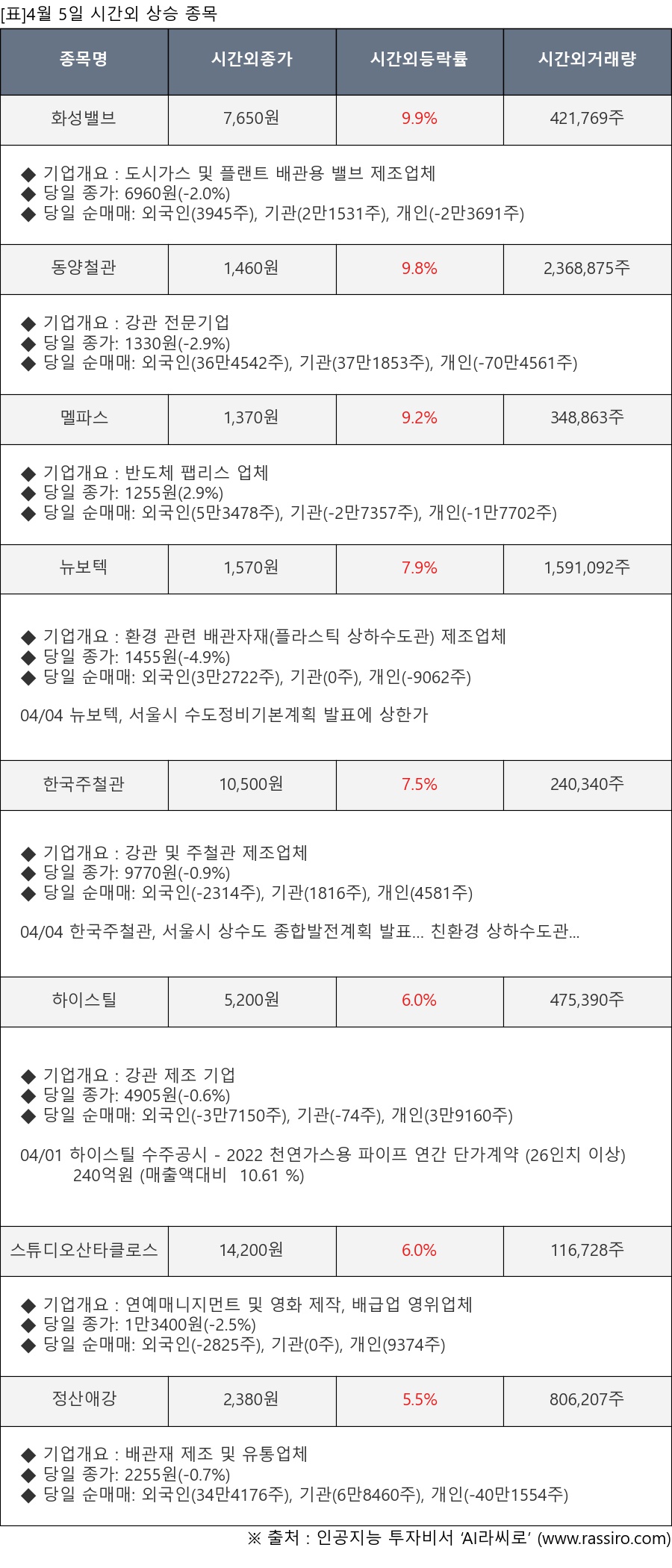 [서울=뉴스핌] 로보뉴스 = 4월 5일, 인공지능 투자비서 ‘AI라씨로’는 시간외 단일가 매매에서 크게 상승한 화성밸브(039610), 동양철관(008970) 등에 대해 최근 동향을 분석했다.