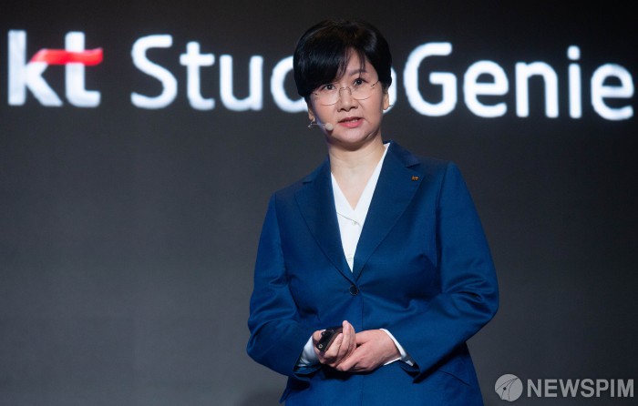 [서울=뉴스핌] 윤창빈 기자 = 김철연 KT스튜디오지니 대표가 7일 오전 서울 송파구 소피텔 엠배서더 서울 호텔에서 열린 KT 그룹 미디어 데이에서 전략발표를 하고 있다. 2022.04.07 pangbin@newspim.com