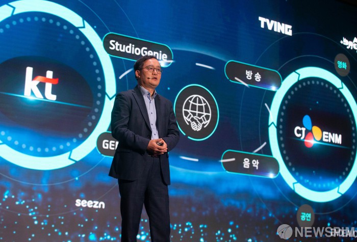 [서울=뉴스핌] 윤창빈 기자 = 강국현 KT 사장이 7일 오전 서울 송파구 소피텔 엠배서더 서울 호텔에서 열린 KT 그룹 미디어 데이에서 전략발표를 하고 있다. 2022.04.07 pangbin@newspim.com