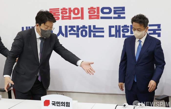 [서울=뉴스핌] 최상수 기자 = 권성동 국민의힘 원내대표(왼쪽)가 11일 오후 서울 여의도 국회 원내대표실을 예방한 이철희 청와대 정무수석에게 자리를 안내하고 있다. 2022.04.11 kilroy023@newspim.com