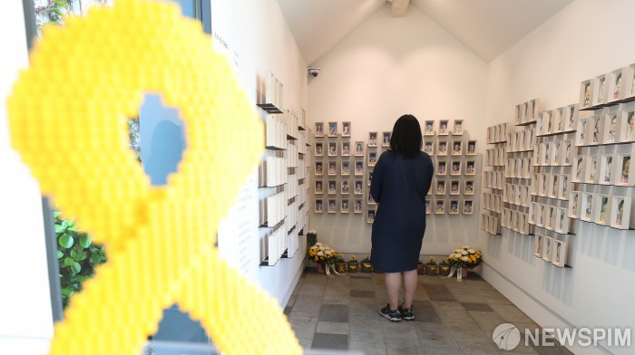 [서울=뉴스핌] 김학선 기자 = 세월호 참사 8주기를 하루 앞둔 15일 서울 중구 세월호 기억공간에 노란 리본이 놓여 있다. 2022.04.15 yooksa@newspim.com