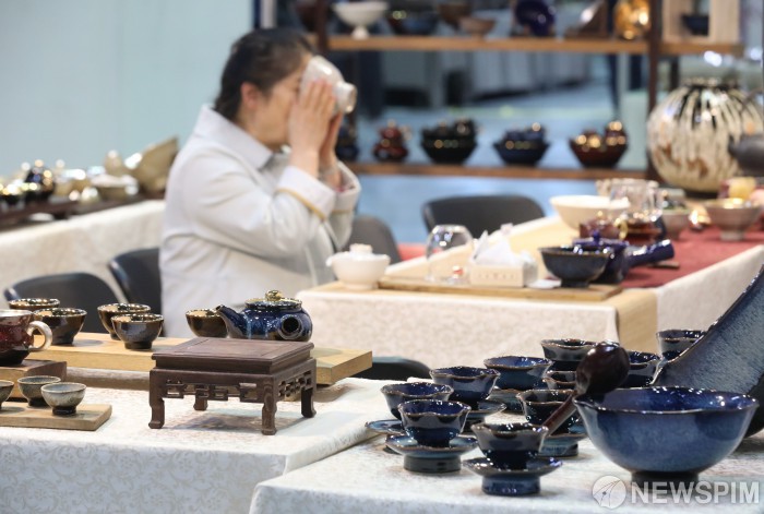 [서울=뉴스핌] 황준선 기자 = 21일 오전 서울 강남구 코엑스에서 열린 서울 국제 차·공예 박람회를 찾은 관람객들이 차 시음을 하고 있다. 2022.04.21 hwang@newspim.com