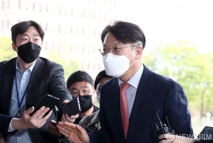 [과천=뉴스핌] 정일구 기자 = 김관정 수원고검장이 21일 오후 '검수완박' 논의를 위한 박범계 법무부 장관 주재 전국 고검장 회의 참석을 위해 경기 과천시 법무부 청사로 들어서고 있다. 2022.04.21 mironj19@newspim.com