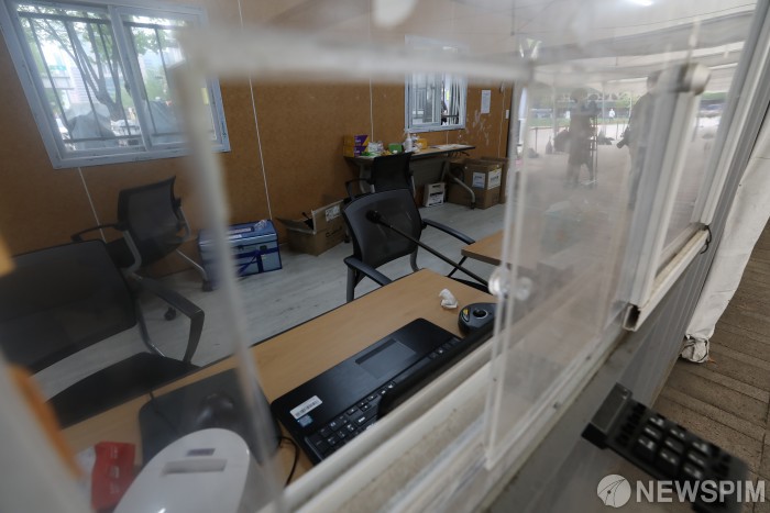 [서울=뉴스핌] 김민지 기자 = 22일 오전 서울광장에 마련된 코로나19 임시선별검사소에 의료진이 사용하던 집기류가 흩어져 있다. 서울시는 오는 24일부터 청계광장에서 시 직영 검사소를 운영한다. kimkim@newspim.com