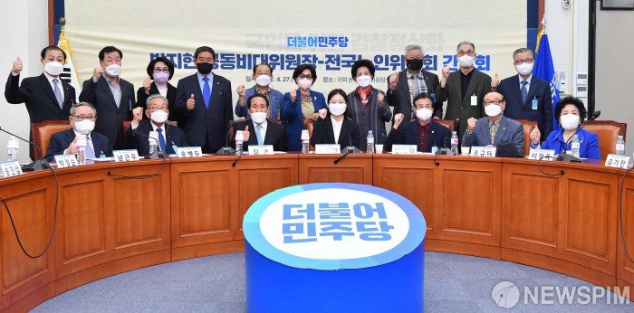 [서울=뉴스핌] 최상수 기자 = 27일 서울 여의도 국회에서 열린 ‘박지현 더불어민주당 공동비상대책위원장-전국노인위원회 간담회’에서 박지현 비대위원장과 김손 노인위원장 등이 기념촬영을 하고 있다. 2022.04.27 kilroy023@newspim.com