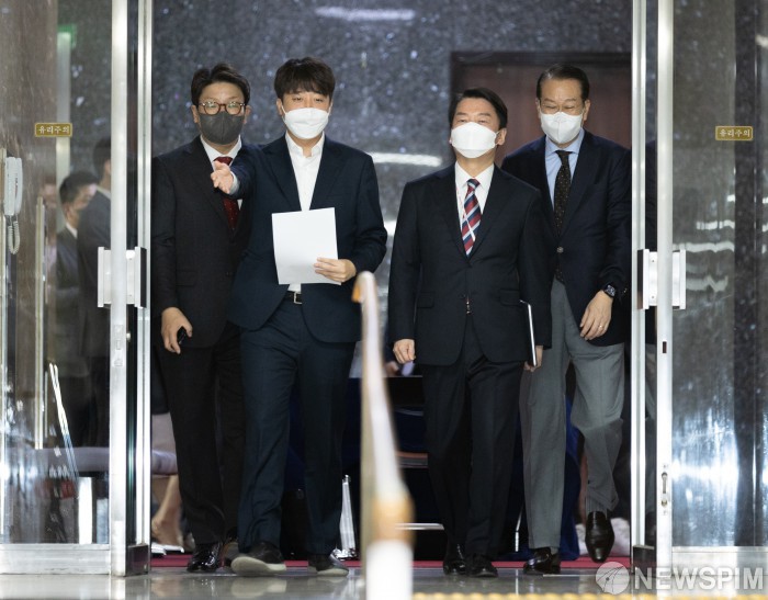 [서울=뉴스핌] 최상수 기자 = 안철수 대통령직인수위원회 위원장(오른쪽 두 번째)과 이준석 국민의힘 대표(왼쪽 두 번째), 권성동 원내대표, 권영세 인수위 부위원장이 28일 오전 서울 여의도 국회에서 열린 국민의힘·대통령직인수위원회 당정협의에 참석하고 있다. 2022.04.28 kilroy023@newspim.com