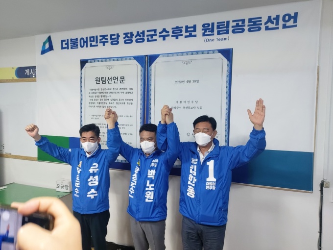 공천 결과 발표에 앞서 오전 9시 30분경 민주당 장성지역위원회에서 세 후보가 만나 원팀 선언식을 진행했다.