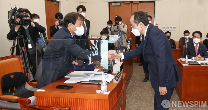[서울=뉴스핌] 최상수 기자 = 추경호 부총리 겸 기획재정부 장관 후보자가 2일 서울 여의도 국회에서 열린 인사청문회에서 윤후덕 기획재정위원장에게 선서문을 제출한 뒤 악수를 나누고 있다. 2022.05.02 kilroy023@newspim.com
