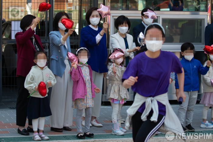 [서울=뉴스핌] 윤창빈 기자 = 유은혜 사회부총리 겸 교육부 장관이 2일 오전 서울 서대문구 서울금화초등학교에서 열린 어린이날 운동회에서 아이들과 함께 응원을 하고 있다. 2022.05.02 pangbin@newspim.com