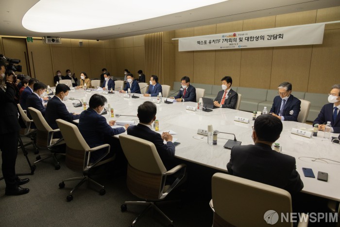 [서울=뉴스핌] 인수위사진기자단 = 3일 오후 서울 중구 대한상공회의소에서 열린 부산엑스포 유치 TF 7차 회의 및 대한상의 간담회가 열리고 있다. 2022.05.03 photo@newspim.com