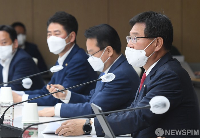 [서울=뉴스핌] 인수위사진기자단 = 이헌승 부산엑스포 유치 TF 팀장이 3일 오후 서울 중구 대한상공회의소에서 열린 '대통령직 인수위 부산엑스포 유치 TF 7차회의'에서 발언을 하고 있다. 2022.05.03 photo@newspim.com