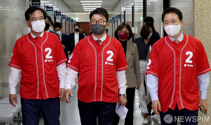 [서울=뉴스핌] 김민지 기자 = 권성동 국민의힘 원내대표가 11일 오전 국회에서 열린 지방선거 중앙선거대책위원회의에 참석하고 있다. 왼쪽부터 송언석 의원, 권 원내대표, 성일종 정책위의장. 2022.05.11 kimkim@newspim.com