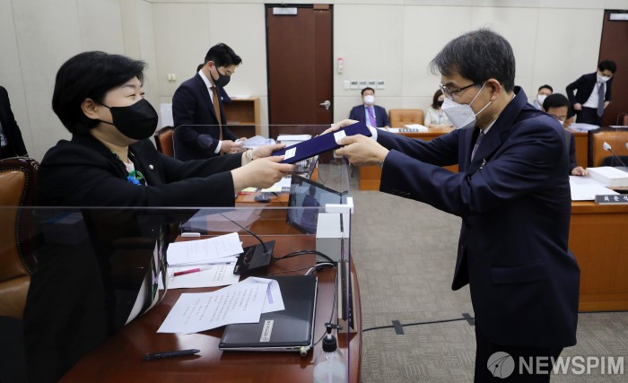 [서울=뉴스핌] 최상수 기자 = 노태악(오른쪽) 중앙선거관리위원장 후보자가 13일 오후 서울 여의도 국회에서 열린 인사청문회에서 선서를 마치고 서영교 국회 행안위원장에게 선서문을 전달하고 있다. 2022.05.13 kilroy023@newspim.com