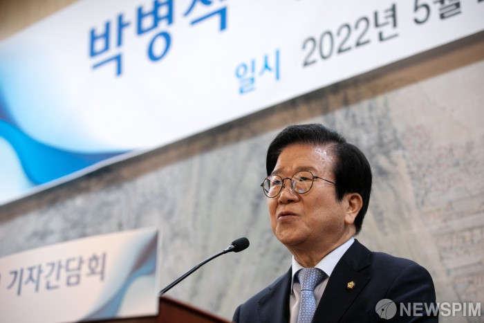 [서울=뉴스핌] 최상수 기자 = 오는 29일 퇴임을 앞둔 박병석 국회의장이 26일 오전 국회에서 퇴임 기자간담회를 열고 21대 국회 전반기를 이끈 소회를 밝히고 있다. 2022.05.26 kilroy023@newspim.com