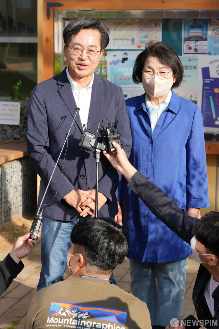 [수원=뉴스핌] 국회사진취재단 = 김동연 더불어민주당 경기도지사 후보가 27일 오전 경기도 수원시 영통구 광교1동 행정복지센터에 마련된 사전투표소에서 부인 정우영 씨와 사전투표를 마친 후 취재진의 질문에 답변하고 있다. 2022.05.27 photo@newspim.com