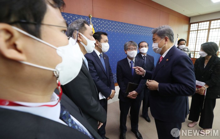 [서울=뉴스핌] 김학선 기자 = 박진 외교부 장관이 27일 서울 종로구 정부서울청사 외교부에서 주한 아세안 대사단과 접견하고 있다. 2022.05.27 yooksa@newspim.com
