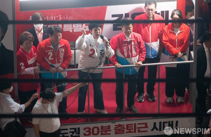 [성남=뉴스핌] 윤창빈 기자 = 김은혜 국민의힘 경기도지사 후보가 27일 오후 경기 성남시 중앙시장 앞에서 열린 유세에서 지지를 호소하고 있다. 2022.05.27 pangbin@newspim.com