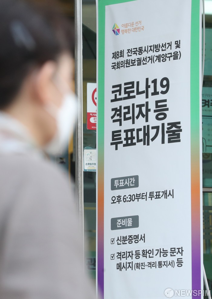 [인천=뉴스핌] 김학선 기자 = 제8회 전국동시지방선거 사전투표 이틀째인 28일 오후 인천 계양구 계양2동 사전투표소 입구에 코로나19 격리자 투표 안내문이 설치되어 있다. 2022.05.28 yooksa@newspim.com