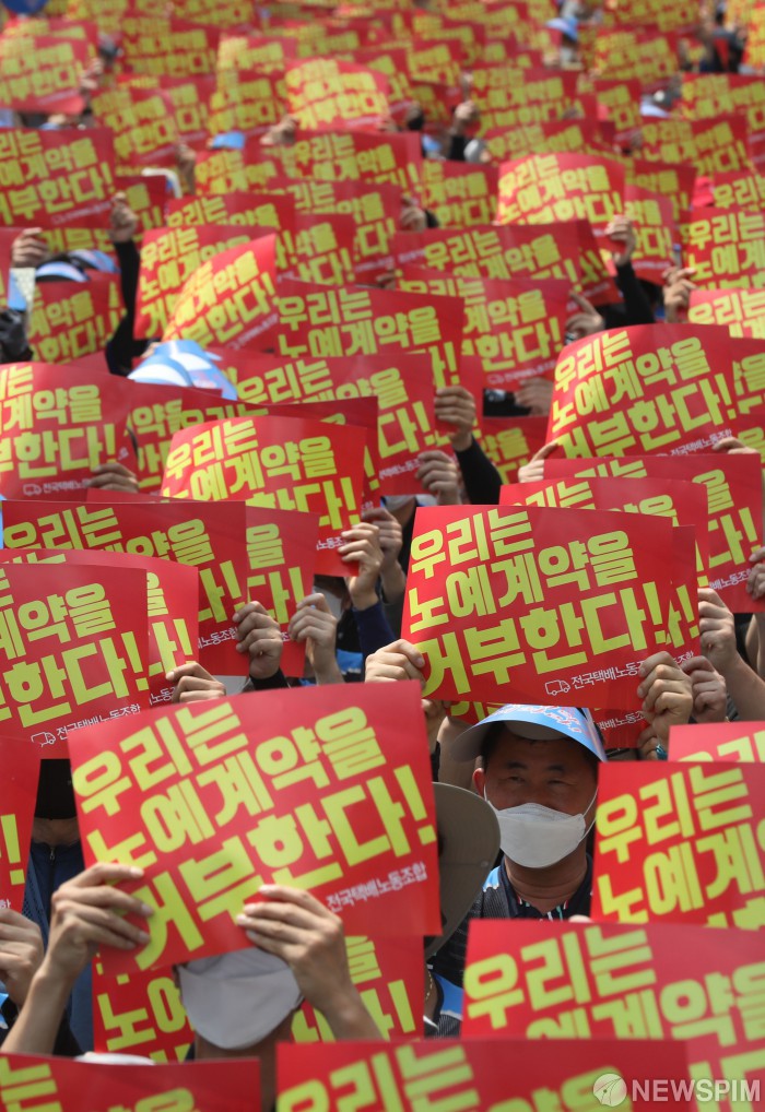 [서울=뉴스핌] 황준선 기자 = 12일 오전 서울 종로구 광화문 우체국 인근에서 전국택배노동조합 우체국본부 조합원들이 '임금삭감, 쉬운 해고 노예계약 저지! 우체국 택배노동자 총력 결의대회'를 하고 있다. 2022.06.12 hwang@newspim.com