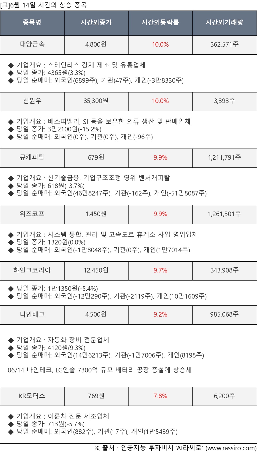 ※ 관련 종목: 대양금속, 신원우, 큐캐피탈, 위즈코프, 하인크코리아, 나인테크, KR모터스