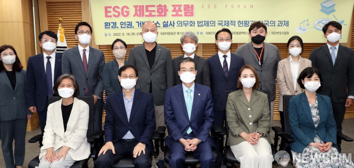 [서울=뉴스핌] 최상수 기자 = 16일 국회 의원회관에서 열린 ESG제도화 포럼에서 조해진(국민의힘), 김성주(더불어민주당) 국회 ESG포럼 공동대표와 이종엽 대한변호사협회장을 비롯한 참석자들이 기념촬영을 하고 있다. 2022.06.16 kilroy023@newspim.com