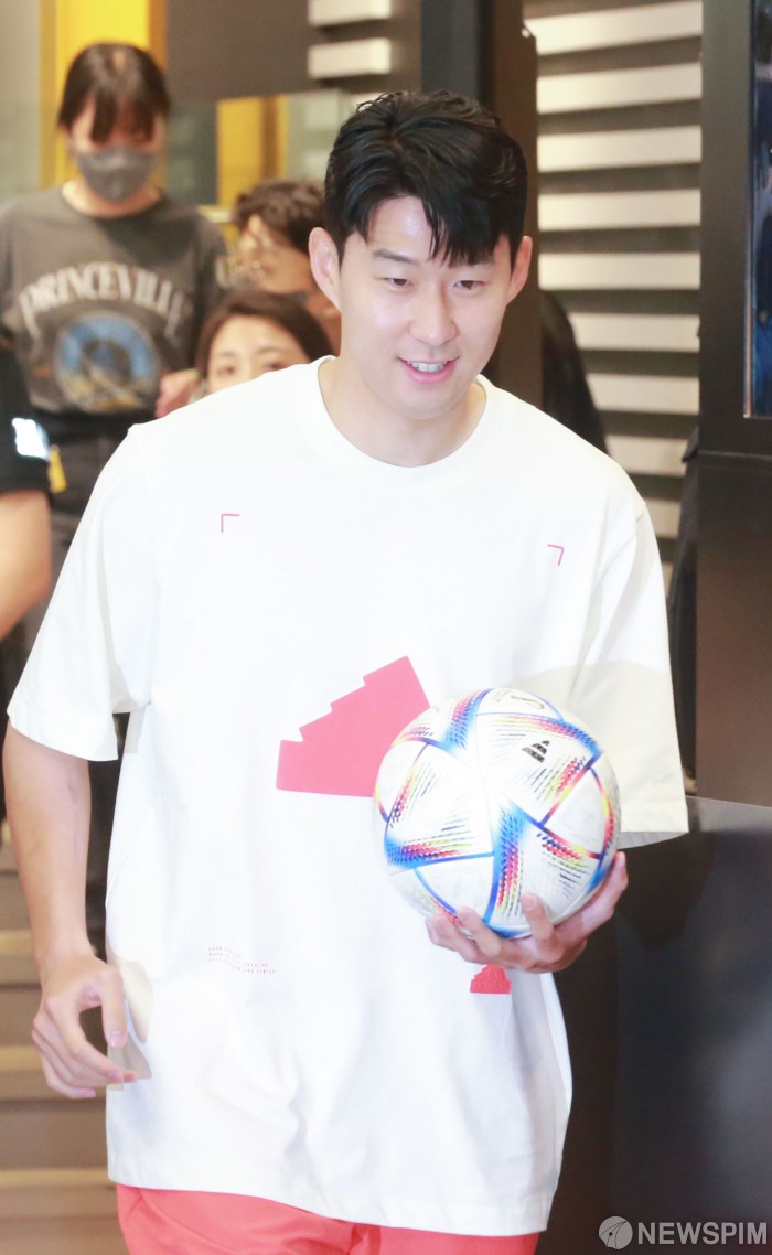 [서울=뉴스핌] 황준선 기자 = 축구선수 손흥민이 4일 오전 서울 마포구 아디다스 홍대 브랜드 센터에서 열린 '손 커밍 데이' 행사에서 2022 카타르 월드컵 공인구 '알 릴라'를 들고 행사장으로 들어서고 있다. 2022.07.04 hwang@newspim.com