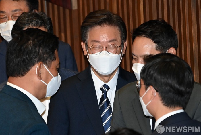 [서울=뉴스핌] 최상수 기자 = 더불어민주당 이재명 의원이 4일 오후 서울 여의도 국회 본회의장에서 열린 제398회 국회(임시회) 제1차 본회의에서 국회의장단 선출 투표를 위해 줄을 서서 기다리며 의원들과 대화를 하고 있다. 2022.07.04 kilroy023@newspim.com