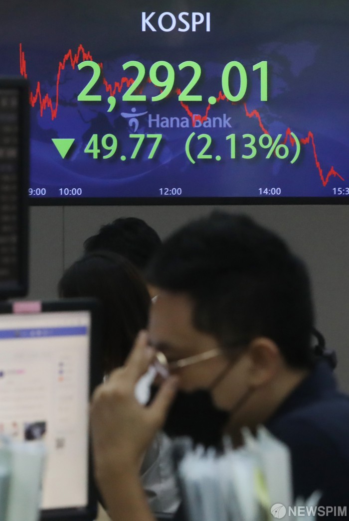 [서울=뉴스핌] 김민지 기자 = 코스피가 1년 8개월 만에 2300선 아래로 내려간 6일 오후 서울 중구 하나은행 딜링룸에 종가가 표시돼있다. 이날 코스피는 전 거래일보다 49.77포인트(2.13%) 내린 2292.01, 코스닥은 744.63, 원·달러환율은 1306.3원에 장을 마감했다. 2022.07.06 kimkim@newspim.com