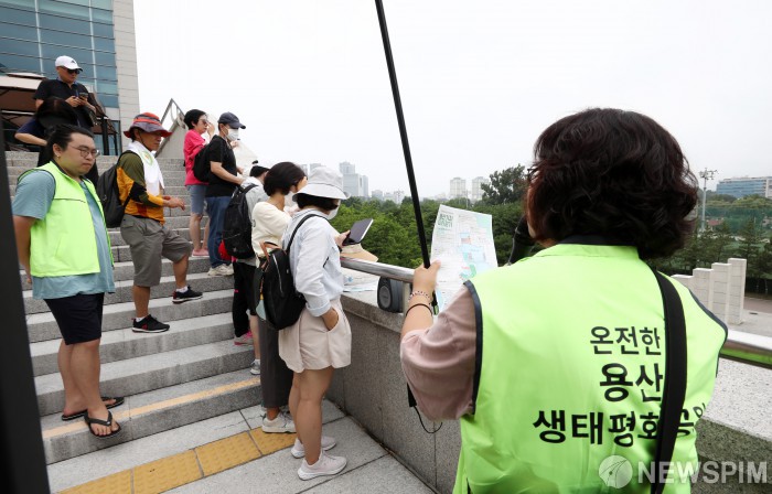 [서울=뉴스핌] 정일구 기자 = 9일 오전 서울 용산구 국립중앙박물관에서 열린 온전한 용산공원 조성을 위한 용산기지 따라걷기에서 서울환경연합 관계자 및 참가자들이 행사에 참석하고 있다. 2022.07.09 mironj19@newspim.com