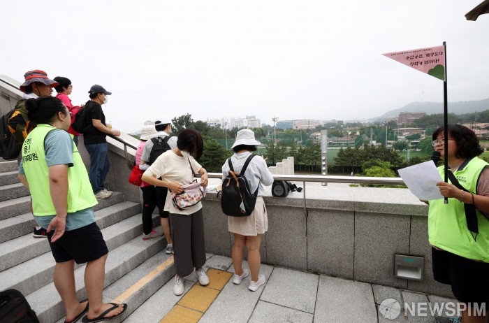 [서울=뉴스핌] 정일구 기자 = 9일 오전 서울 용산구 국립중앙박물관에서 열린 온전한 용산공원 조성을 위한 용산기지 따라걷기에서 서울환경연합 관계자 및 참가자들이 행사에 참석하고 있다. 2022.07.09 mironj19@newspim.com