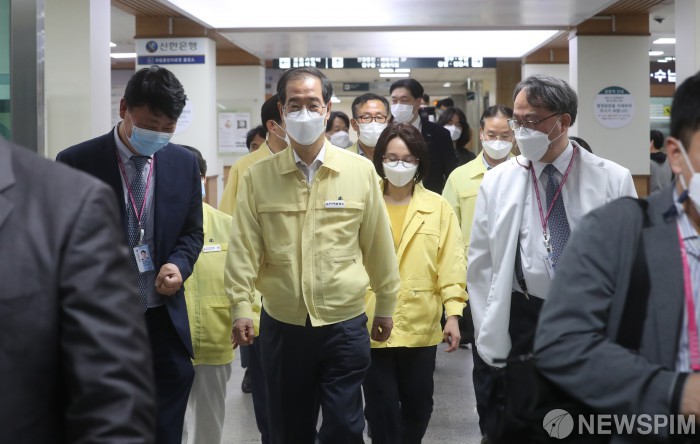 [서울=뉴스핌] 김학선 기자 = 코로나19 병상 현장점검을 마친 한덕수 국무총리가 13일 서울 중구 국립중앙의료원을 나서고 있다. 2022.07.13 yooksa@newspim.com