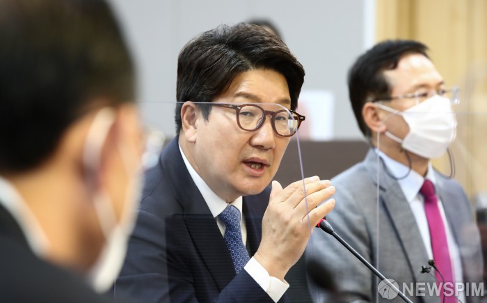 [서울=뉴스핌] 최상수 기자 = 국민의힘 권성동 당대표 직무대행 겸 원내대표가 14일 국회 의원회관에서 열린 '통신요금 다양화와 소비자권익 증진' 긴급토론회에 참석해 인사말을 하고 있다. 2022.07.14 kilroy023@newspim.com