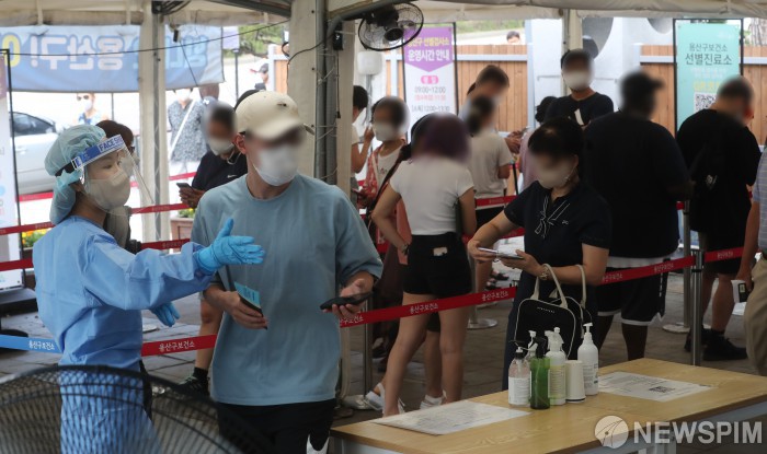 [서울=뉴스핌] 김학선 기자 = 코로나19 신규확진자가 4만1310명을 기록하며 재확산하고 있는 가운데 16일 서울 용산구보선소 선별진료소에서 시민들이 검사를 받기 위해 줄 서 있다. 2022.07.16 yooksa@newspim.com