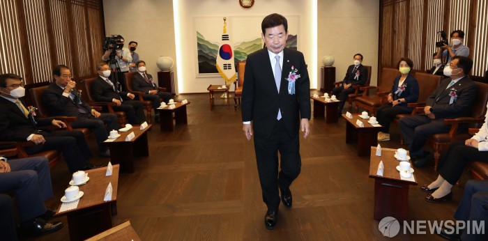 [서울=뉴스핌] 윤창빈 기자 = 김진표 국회의장이 17일 서울 여의도 국회 의장 접견실에서 제74주년 제헌절인 경축행사를 앞두고 5부요인, 여야 정당 대표와 환담 중 잠시 자리를 비우고 있다. pangbin@newspim.com