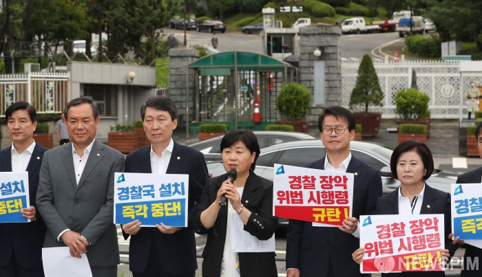 [서울=뉴스핌] 국회사진취재단 = 더불어민주당 윤석열 정권 경찰장악 저지 대책단이 21일 오전 서울 용산구 대통령 집무실 앞에서 윤석열 정부 경찰 장악 규탄 기자회견을 하고 있다. 2022.07.21 photo@newspim.com