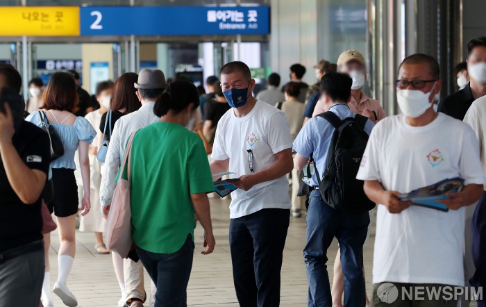 [서울=뉴스핌] 정일구 기자 = 경찰직장협의회 관계자들이 25일 오전 서울 중구 서울역에서 행정안전부의 경찰국 신설에 반대하는 대국민 홍보전을 진행하고 있다. 2022.07.25 mironj19@newspim.com