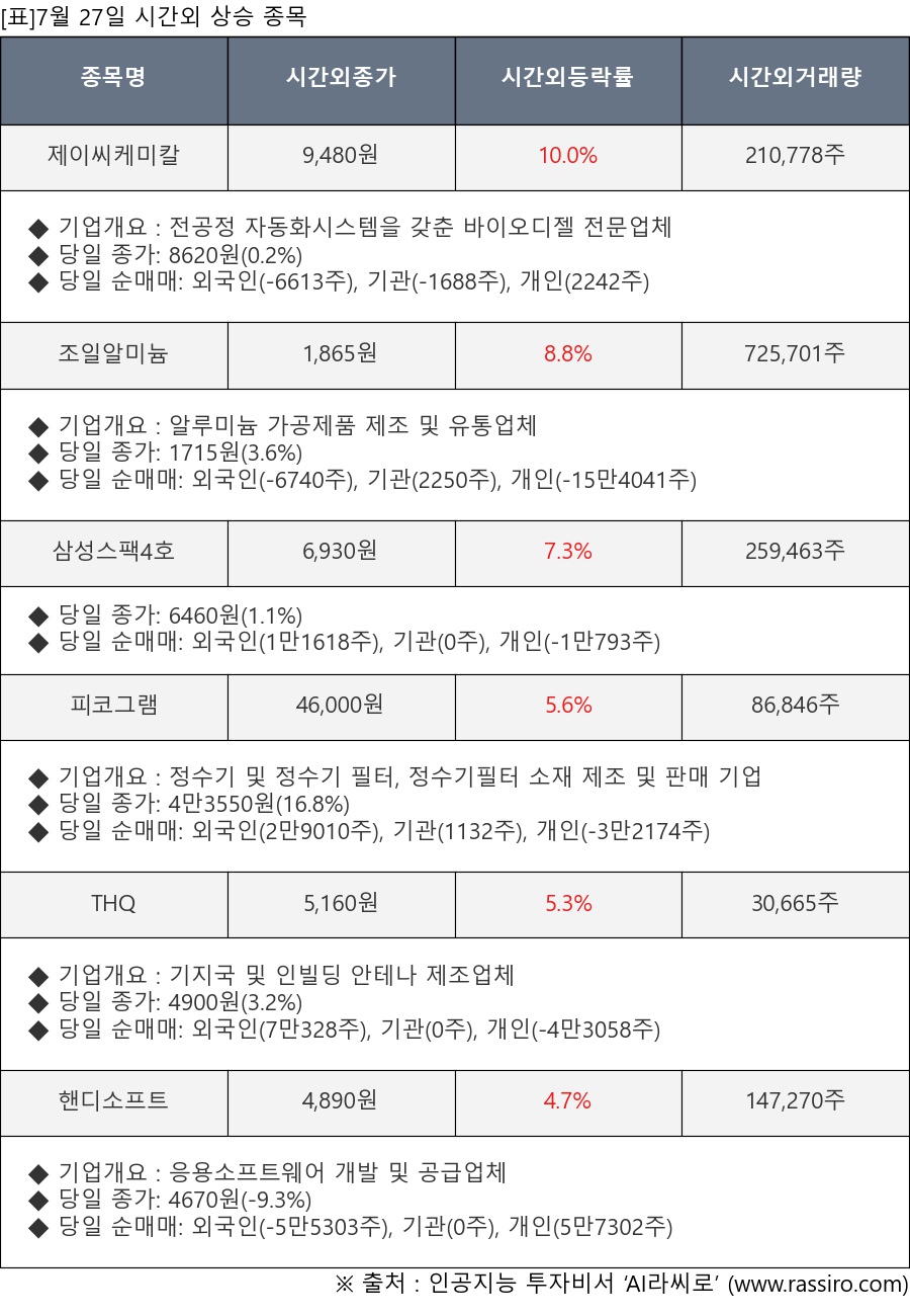 ※ 관련 종목: 제이씨케미칼, 조일알미늄, 삼성스팩4호, 피코그램, THQ, 핸디소프트