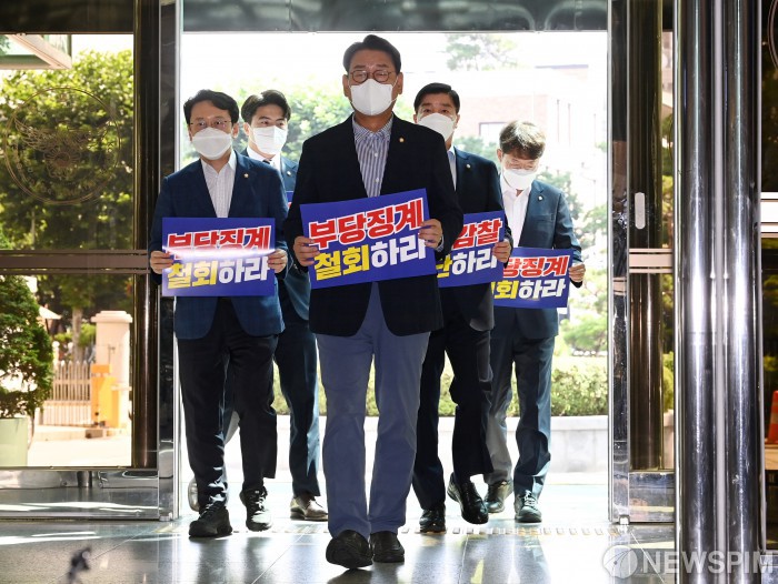 [서울=뉴스핌] 국회사진취재단 = 국회 행정안전위원회 야당 간사인 김교흥 더불어민주당 의원을 비롯한 행안위원들이 경찰서장 회의 부당징계 관련해 29일 오전 서울 서대문구 경찰청에 항의 방문을 하고 있다. 2022.07.29 photo@newspim.com