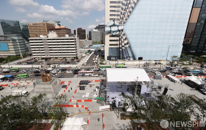 [서울=뉴스핌] 김민지 기자 = 광화문광장 재개장을 하루 앞둔 5일 오후 서울 종로구 광화문광장에서 막바지 작업이 이뤄지고 있다. 광화문광장 재개장은 재구조화 공사를 시작한 지 1년 9개월 만이다. 2022.08.05 kimkim@newspim.com