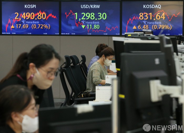[서울=뉴스핌] 황준선 기자 = 5일 코스피는 전 거래일(2473.11)보다 17.69포인트(0.72%) 오른 2490.80에 장을 닫았다. 코스닥지수는 전 거래일(825.16)보다 6.48포인트(0.79%) 상승한 831.64에 거래를 마쳤다. 원·달러 환율은 전 거래일(1310.1원)보다 11.8원 내린 1298.3원에 마감했다. 이날 오후 서울 중구 하나은행 딜링룸 전광판에 지수가 표시돼 있다. 2022.08.05 hwang@newspim.com