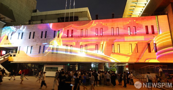 [서울=뉴스핌] 이형석 기자 = 6일 밤 서울 종로구 광화문광장에서 열린 빛모락 개장 기념행사에서 미디어파사드가 공개되고 있다. 2022.08.06 leehs@newspim.com