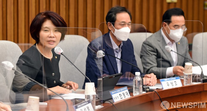 [서울=뉴스핌] 최상수 기자 = 17일 국회에서 '경찰국 신설, 무엇이 문제인가?'란 주제로 열린 더불어민주당의 윤석열정권 경찰장악대책위원회 간담회에서 한정애 위원장이 모두발언을 하고 있다. (공동취재사진) 2022.08.17 photo@newspim.com
