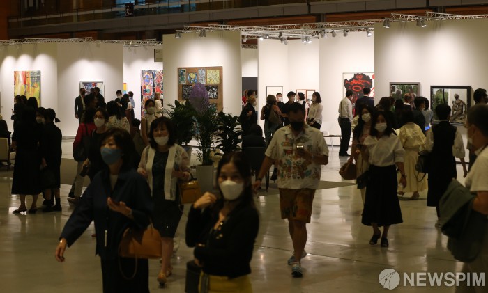 [서울=뉴스핌] 황준선 기자 = 2일 오후 서울 강남구 코엑스에서 개막한 '프리즈(Frieze) 서울'을 찾은 관람객들이 작품을 관람하고 있다. 세계 3대 아트페어 중 하나인 프리즈는 이날 아시아 최초로 서울에서 개막해 오는 5일까지 열린다. 2022.09.02 hwang@newspim.com